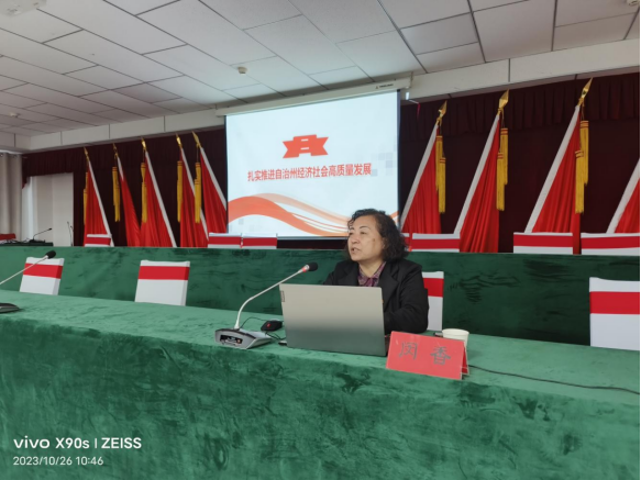 博州党委党校高级讲师闵香老师以《扎实推进自治州经济社会高质量发展》为题,围绕自治州党委十三届六次全会召开的主要背景、主要精神、保障措施三个方面,通过深入浅出的讲解、运用案例分析等方式,面对面向党员干部宣讲,引导党员干部在新时代新征程上团结奋斗、勇毅前行,为建设美丽博州贡献力量。