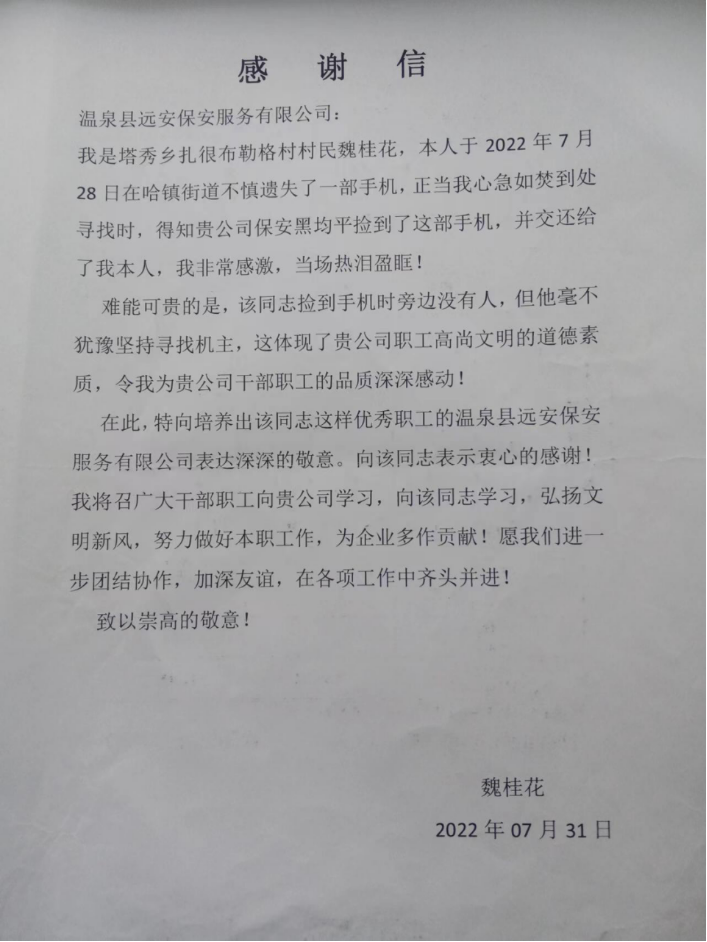 2022年7月28日,黑均平在哈日布呼镇南街发现有一个大姐手机掉了,于是他高声呼喊“大姐,你手机掉了。”但是大姐没有听到直接走了,于是他连忙去追,可惜三轮车没有电了,于是没有追上,他只好回家等失主打电话。