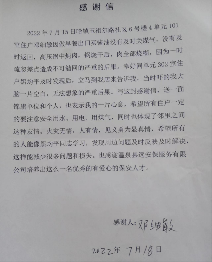 2022年7月15日,黑均平回家途中发现一楼邻居家中浓烟滚滚,上去敲门却发现家中无人,于是立即跑到邻居在北街店铺里告知其家中起火情况,因黑均平的及时告知避免了一场火灾的发生,此次事故原因是邻居家邓大姐炖肉时发现家中没有酱油,出门买酱油后,未及时返回造成。邓大姐说:“当时我吓的腿都软了,幸好黑均平告知及时,不然后果不堪设想。”