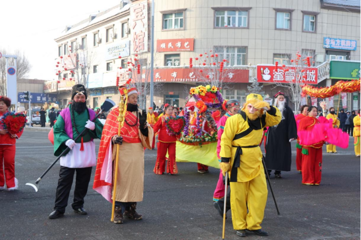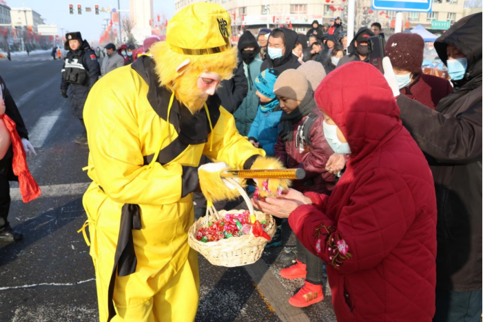 紧接着,西游四人组的登场瞬间成为了全场的焦点,他们在十字路口的中心舞台上演了一出精妙的表演,为在场的每一位观众带来了欢声笑语,气氛热烈非凡。但这仅仅是社火表演精彩篇章的一个高潮,而非终结。随后,整支社火队伍浩浩荡荡地向东行进,沿街与民众亲密互动,将无尽的欢乐与美好的祝福播撒到每个人的心田。他们与观众热情交流,共同分享着节日的欢愉,使得整个哈日布呼镇被一片欢乐祥和、温馨融洽的气氛所笼罩。