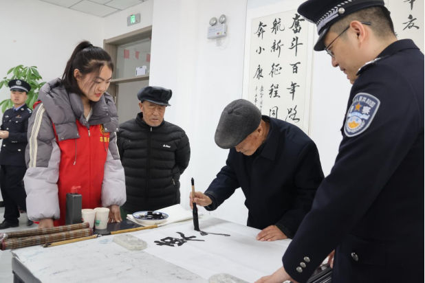 值得一提的是,活动现场,一位擅长书法的老人挥毫泼墨,一幅幅苍劲有力的书法作品跃然纸上,每一笔都透露出他对生活的热爱和对社会的感恩。在挥毫之际,大爷深情地写下“警民一家亲”五个大字,瞬间点燃了现场的气氛,赢得了在场所有人的阵阵赞叹。这五个字不仅是对警民关系的最好诠释,更是对哈日布呼边境派出所民警们和志愿者服务队无私奉献精神的最高赞誉。