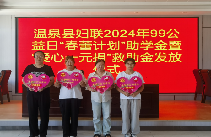 为进一步做好困境妇女儿童关爱工作,切实把党和政府的关怀和温暖送到困境妇女儿童家中,近日,温泉县妇联2024年99公益日“春蕾计划”助学金暨“爱心一元捐”救助金发放仪式在哈日布呼镇厄布得格路社区举办。仪式上,为哈日布呼镇3名困难家庭妇女或学生发放“爱心一元捐”公益项目救助金共计5000元,为4名困难家庭学生发放99公益日“春蕾计划”项目资助金共计13200元,切实将党和政府的关怀及社会各界爱心人士的关心送到困境对象身边。