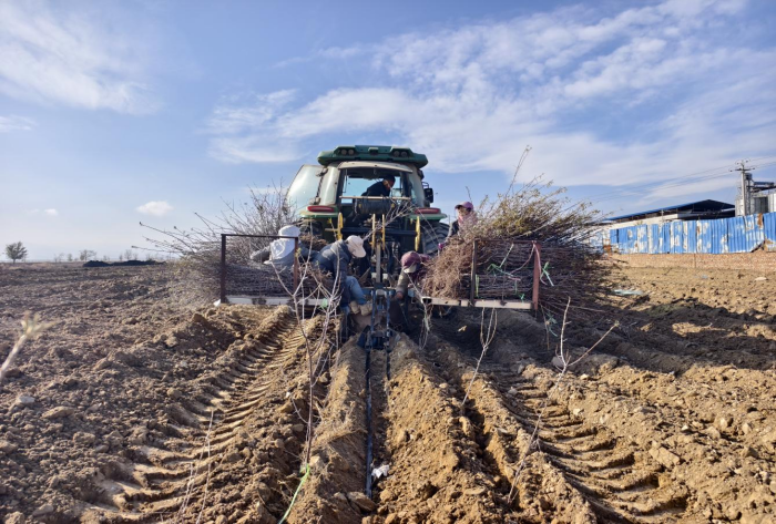近日,哈日布呼镇枣格图村 540 亩退化林修复现场一派热火朝天的施工景象,机器轰鸣声与工人作业声交织,奏响生态修复 “奋进曲”。现场多台植树机往来穿梭,精准完成挖坑、起苗、定植全流程作业,滴灌带铺设团队同步跟进管线布设,确保栽苗、供水 “无缝衔接”。