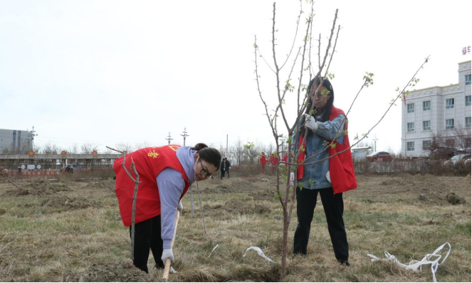 活动现场干部职工、志愿者热情高涨。大家分工协作、配合默契,挥锹铲土、扶苗培土、提水浇灌,经过一天劳动,522株榆叶梅、红叶海棠、红叶杏、裂叶榆等兼具生态效益与景观效果的苗木整齐列队。