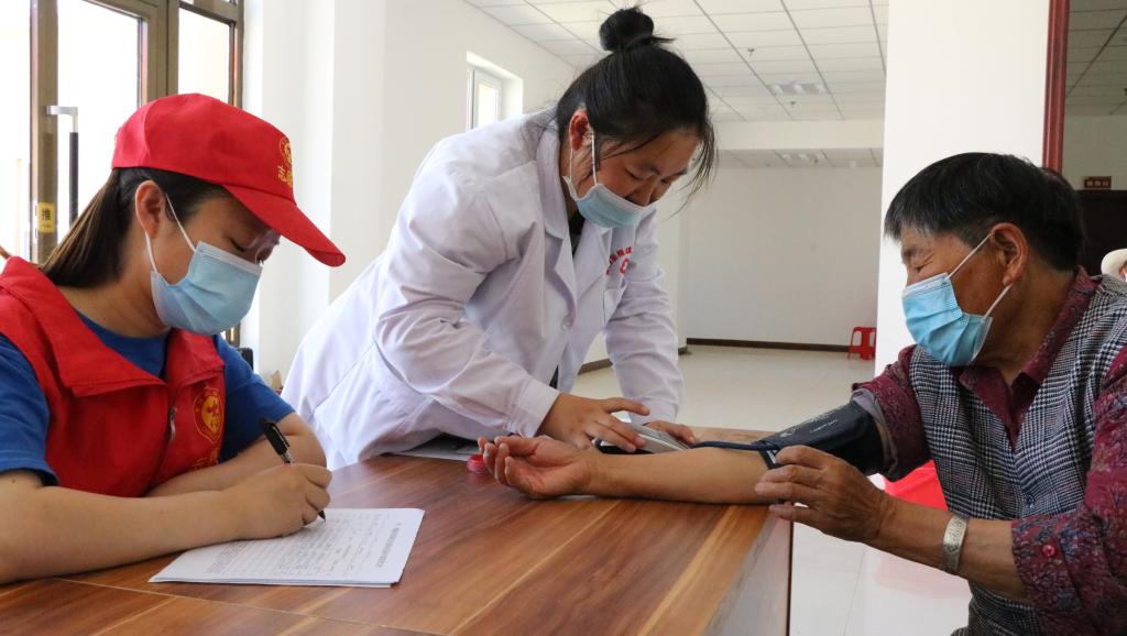 暖心的“流动接种点”。安格里格镇卫生院的医护人员们携带着血压计、听诊器、血糖仪等医疗设备在幸福大院为大家测量血压、心率,为居民提供就近接种服务。