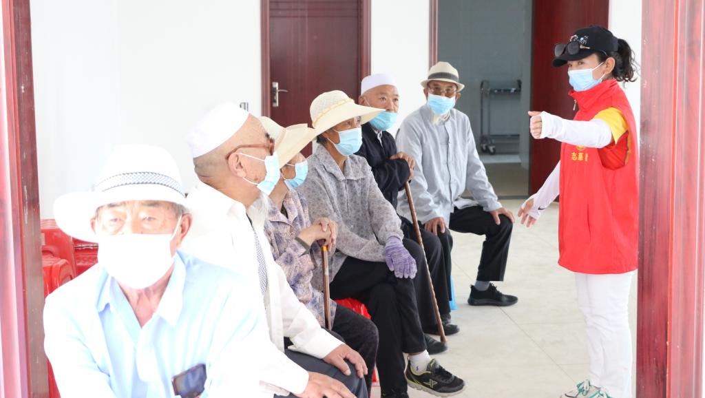 “我们今天先过来给您做个检查,检查没有问题了我们就带您打疫苗。”安格里格镇志愿者乌日木古丽与医生们一起,为老年群体接种时的注意事项进行答疑解惑。