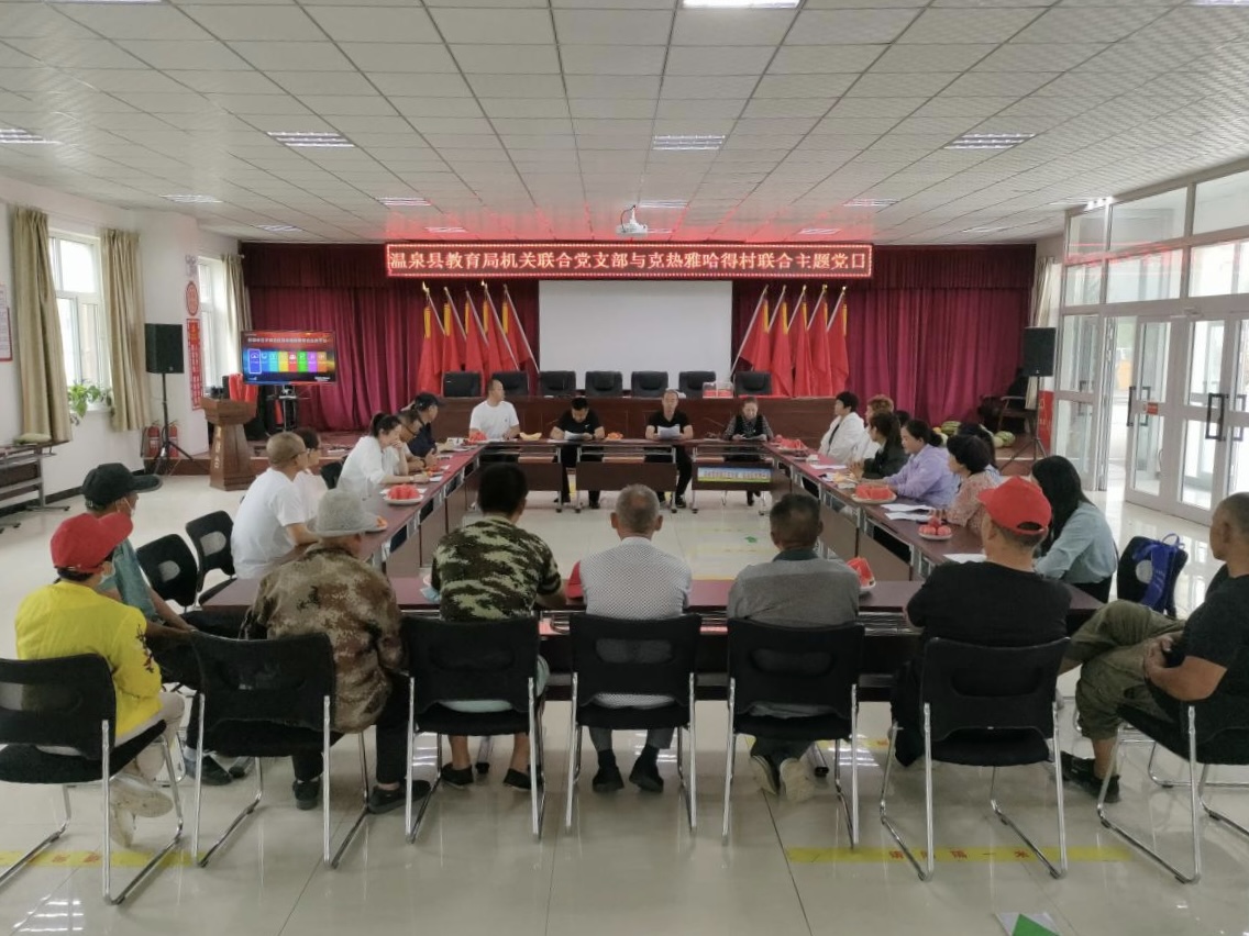 温泉县教育局党支部与克热雅哈得村党支部联合为党亲生主题党日活动,旨在丰富支部文化生活,党员们集体欢庆党的101岁诞辰,互赠红色经典书籍、贺卡、学习党的历史、重温入党誓词、讲述党员心声,为党庆生。