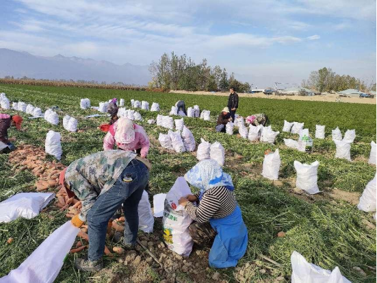 据了解,胡萝卜只是昆得仑布呼村创富增收、促进乡村振兴“金点子”的一个缩影。今年以来,安格里格镇党委、政府以农业供给侧结构性改革和乡村振兴战略为指引,壮大村集体收入。整合各村队的特色资源优势,积极引导村队调整种植结构。就如盛产时鲜果蔬的昆得仑布呼村,在今年5月成立了温泉县振兴富民果蔬经营专业合作社,由村集体带头发力,引进山东特色胡萝卜、土豆等时蔬,同时建立存储量500吨的冷鲜库,形成“种植+产业”的村集体特色产业链,目前冷鲜库处300多吨胡萝卜外,还处藏有土豆等时蔬共计480吨,其产品多销往当地大型商超、酒店、酒店等,顺便带动了当地村民从种植、生产、配送等方面提供了一些就业岗位。在有着博州“小粮仓”美誉的安格里格镇,这样传统农业+产业的结合,让昆得仑布呼村成为了独具翘楚、农业发展潜力最大的农产品资源储备区。