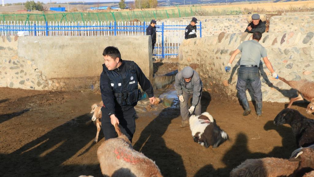 清晨的草原上,民警们化身“临时牧工”:有的在泥泞中疏导羊群通道,有的耐心指导村民安全操作。民警宗位鑫汗水浸透警服却毫无怨言:“群众的小事就是我们的大事。药浴关系到牧民全年收入,我们必须守好这道‘健康防线’。”在警民协作下,药浴效率提升40%,8000只羊在2天内全部完成防疫工作,无一伤亡。村民阿得里汗激动地说:“民警像亲人一样帮我们,羊群健康了,我们的日子更有奔头!”