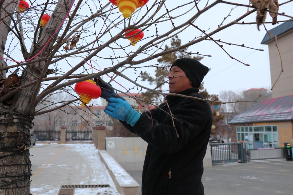 连日来,镇机关工作人员与物业人员携手,将一盏盏灯笼、福袋灯等饰物装点在树木之间。同时,全镇积极开展积雪清理与环境整治,各村组织“两委”成员、志愿者和居民共同清理巷道积雪、整理房前屋后杂物,打造整洁有序的镇容村貌,提升节日期间的宜居感受。