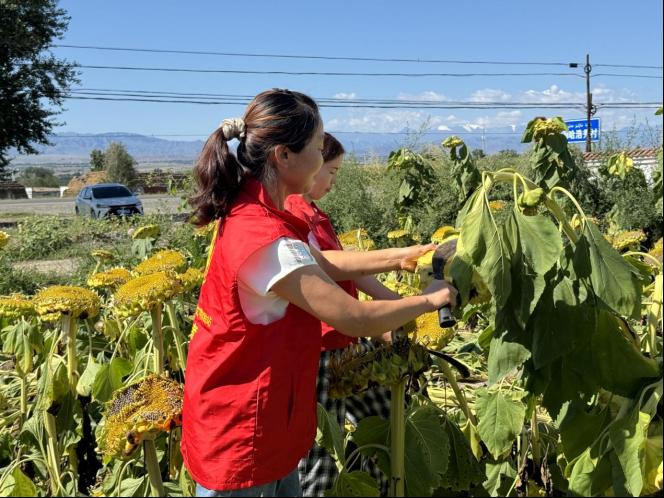 走进闹哈浩秀村田间地头,金灿灿的向日葵顶着饱满的花盘,弯下了腰。志愿者们挥舞着镰刀娴熟地收割食葵,个个干劲十足、手里有活、脸上有笑、挥汗如雨,现场一派热火朝天的丰收景象。“今年食葵收成还可以吗?其他庄稼的收成怎么样?”志愿者们一边割食葵,一边与村民唠家常,了解他们的生产生活状况。
