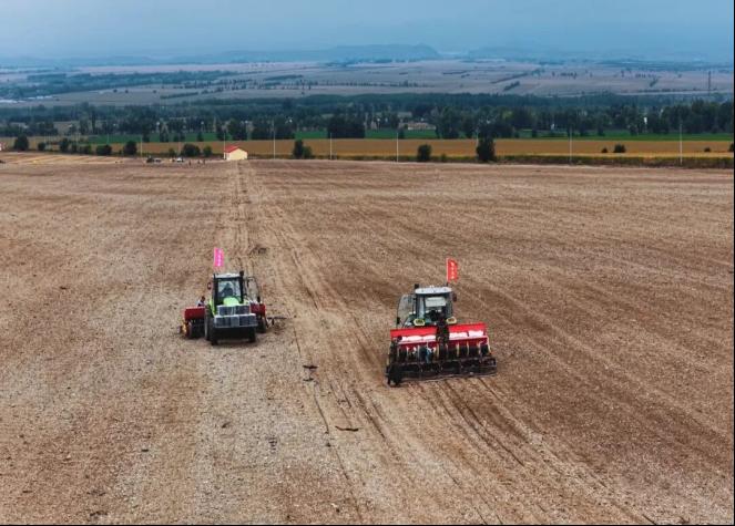9月22日,在查干苏木村种植户马全的农田里,播种机正开足马力在田间来回穿梭,精量播种、铺设滴灌带等环节一气呵成,呈现出一派繁忙的农耕景象。“今年我种植了700亩冬小麦,选用的是‘九圣禾D1508’品种,全部采用机械化耕种模式,非常高效便捷,预计两到三天就能完成播种。”