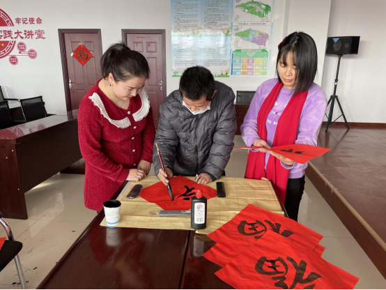 活动现场,墨香飘逸,喜气盈盈。参与活动的大学生、村干部都凝神聚气,用笔墨书写“日暖神州万物荣,春回大地千山秀”等10余副对联,寄托了对祖国山河的特殊情怀,体现大家辞旧迎新、建功立业的美好愿望。
