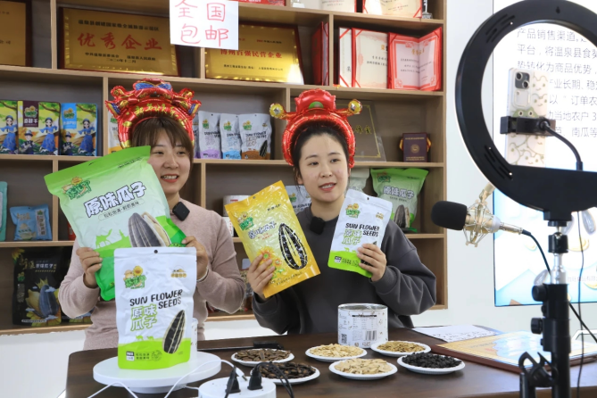 “我们的葵花郎、噼啪食客系列瓜子,绿色生态种植,味道醇厚,粒粒飘香,是招待宾客及馈赠亲友之佳品。”在温泉县塔秀乡一村一产胜旺食品有限公司电商直播间里,带货达人沙日娜正在向粉丝推介产品。葵花郎原味瓜子因日照充足,无添加,低油低盐,品质优良而受到广大网友的喜爱。