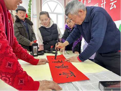 演出结束后,台布勒哈特队文化能人为演员和观众们撰写春联送上祝福,春联与“福”字,在纸上翩翩起舞,寓意着幸福降临。那刚劲有力的书法,承载着浓浓的喜庆和祝福,透过书写将这祝福送给每一个人。