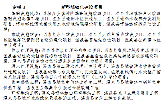 群众生活有效保障。投入16.8亿元,实施安居富民7457户、定居兴牧598户、棚户区改造4685户,完成国有牧场危房改造8195户。建设加气站一座,天然气入户1800户。投入2.5亿元,建设公路275.6公里,哈夏林场公路、小温泉公路、X208线温泉段改建等项目建成投用,县新客运站全面投入使用。成功创建自治区级“四好农村路”示范县。投入1.63亿元建成投用北线三个乡镇场集中供水工程,解决39个行政村2.5万人安全饮水问题。投入1500万元,建成并投用规模化屠宰场2座。安全生产责任全面落实,防灾减灾体系不断完善。实施全民免费健康体检。人口计划生育奖补政策全面落实。依法加强食品药品市场监督管理,食品药品安全防线更加牢固。