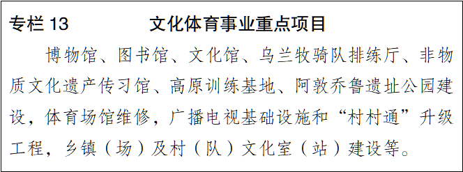 坚持以现代文化为引领,大力实施文化惠民工程和文化精品工程,弘扬民族优秀文化,加大文化专业人员的培养、引进力度,促进文化事业大发展、大繁荣。加快基层公共文化基础设施建设,建成覆盖城乡、功能比较完善的公共文化服务体系,积极争取图书馆、文化馆、博物馆等项目建设,提升服务功能,加强新时期乌兰牧骑队建设,满足人民群众不断增长的精神文化需求。