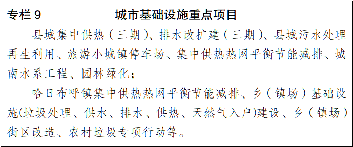 ——城镇化发展目标。到2020年,形成博格达尔镇、哈日布呼镇、安格里格镇“三足鼎立”城镇发展新格局,进一步增强城镇辐射带动能力。户籍人口城镇化率达54%。加快县城扩容提质,建成一批重大城市基础设施,县城建成区绿化覆盖率达50%以上。社会公共服务均衡发展,广播电视覆盖率达97%以上,城镇燃气普及率达到90%以上,城镇供水普及率达到100%。