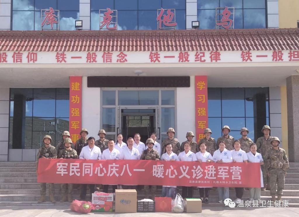 为庆祝八一建军节的到来,营造拥军、爱军良好氛围,发扬双拥工作优良传统, 温泉县蒙医医院(扎勒木特乡卫生院)深入边境一线,开展“军民同心庆八一,暖心义诊进军营”拥军义诊慰问活动。