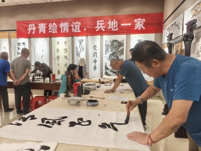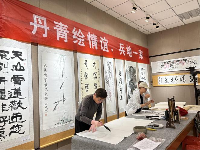 现场,书画家们围坐案前,即兴挥毫。或勾勒兵地交融的生活场景,或描绘共同守护的秀美风光,或书写“兵地一家亲”的暖心诗句,笔墨间流淌着对团结协作的赞美与对美好未来的期许。创作之余,大家相互观摩作品、交流技法心得,从构图构思到色彩运用,分享创作灵感,在互动中增进艺术共识,更拉紧了兵地文化交融的纽带。
