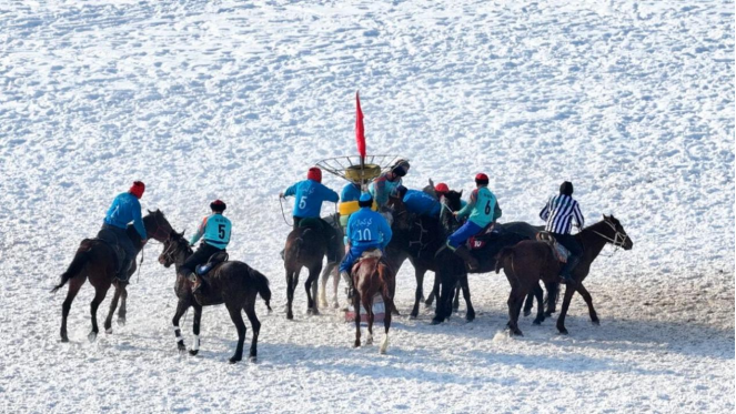 比赛现场,骑手们身着统一比赛服装,驾驭着矫健的伊犁马整齐列队,神情坚毅而专注。随着裁判一声清脆的哨响,骑手们立刻策马扬鞭,如离弦之箭般冲出起跑线,围绕目标展开激烈争夺。赛场上,他们时而俯身精准刁羊,动作干脆利落;时而巧妙迂回突围,尽显灵活机敏;时而默契配合掩护,彰显团队力量。骑手们精湛的控马技巧、果敢的拼搏姿态与伊犁马的矫健迅猛相得益彰,生动展现出“草原雄鹰”的飒爽豪迈,每一个精彩瞬间都赢得现场观众的阵阵喝彩与热烈掌声。