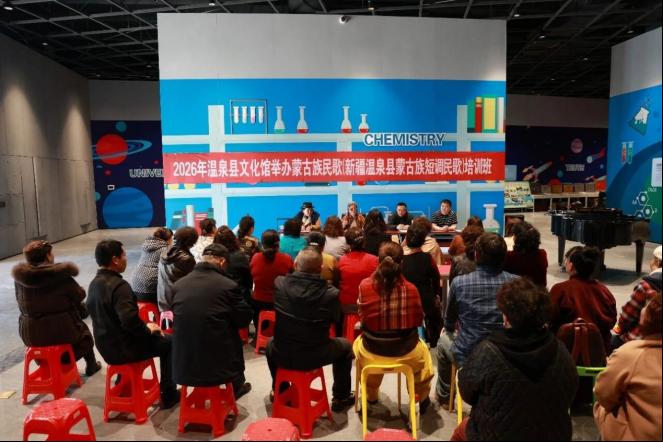 3月16日,由温泉县文化馆主办的2026年蒙古族民歌(新疆温泉县蒙古族短调民歌)培训班正式开班。此次培训特邀自治区级非物质文化遗产代表性传承人江姑授课,来自全县八个乡镇场的蒙古族短调民歌爱好者齐聚一堂,共赴一场非遗文化之约,沉浸式学习并传承这一独具特色的民族民间艺术。