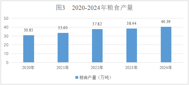 全年粮食产量40.39万吨,比上年增加1.95万吨,增长5.1%,其中:小麦产量2.28万吨、玉米产量37.29万吨、薯类产量0.82万吨。