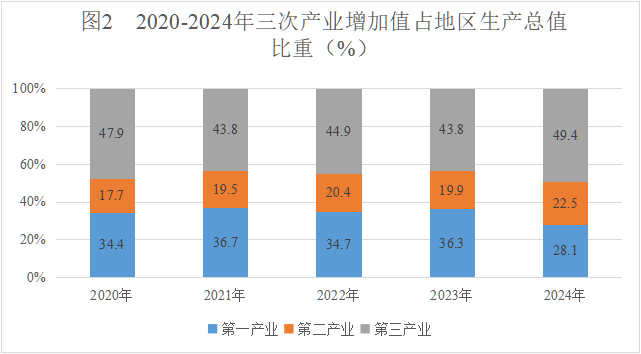 根据地区生产总值统一核算结果,全县地区生产总值(GDP)458644万元,按可比价计算,比上年增长5.2%。分产业看,第一产业增加值128782万元,增长5.8%,占地区生产总值的28.1%;第二产业增加值103368万元,增长7.3%,占地区生产总值的22.5%;第三产业增加值226494万元,增长4.0%,占地区生产总值的49.4%。