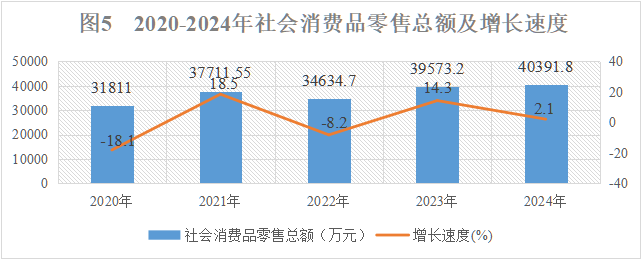 全年社会消费品零售总额40391.8万元,同比增长2.1%。按行业划分:批发业商品销售额89450.7万元、增长1.2%;零售业商品销售额37090.7万元、增长3.0%;住宿业营业额3344.6万元、增长21.4 %,餐饮业营业额6102.5万元、增长15.3%。