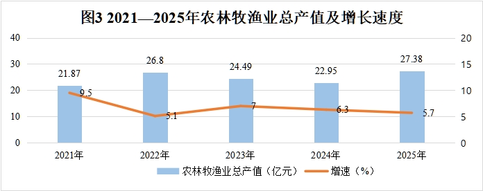 2025年,温泉县完成农林牧渔业总产值27.38亿元,同比增长5.7%(可比价增速),增加值占全县地区生产总值38.1%。其中,农业产值17.26亿元,同比增长5.2%,占全县农林牧渔业总产值的63.0%;畜牧业产值7.34亿元,同比增长3.9%,占全县农林牧渔业总产值的26.8%;林业产值0.57亿元(不含水果),同比增长14.6%,占全县农林牧渔业总产值的2.1%;渔业产值0.0972亿元,同比增长16%,占全县农林牧渔业总产值的0.4%;农林牧渔专辅活动产值2.11亿元,同比增长13.1%,占全县农林牧渔业总产值的7.7%。
