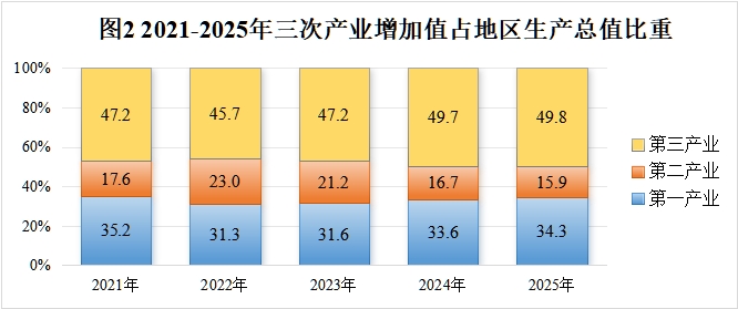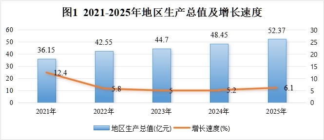 根据地区生产总值统一核算结果,全县地区生产总值(GDP)523691万元,按可比价计算,比上年增长6.1%。分产业看,第一产业增加值179599.1万元,同比增长4.9%,占地区生产总值的34.3%;第二产业增加值83137.3万元,同比增长4.2%,占地区生产总值的15.9%;第三产业增加值260954.6万元,同比增长7.5%,占地区生产总值的49.8%。