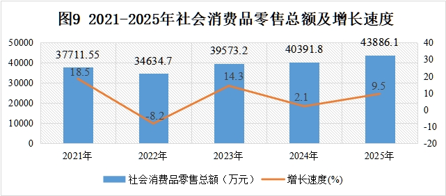 全年社会消费品零售总额43886.1万元,同比增长9.5%。按行业划分,批发业商品销售额95682.9万元,同比增长2.4%;零售业商品销售额39362万元,同比增长7.6%;住宿业营业额6898.5万元,同比增长42.1%;餐饮业营业额13837.4万元,同比下降3.9%。