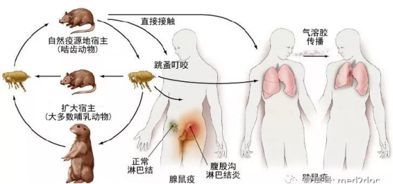 鼠疫的传播途径主要有两种:1.蚤叮咬的传播方式为鼠-蚤-人,即跳蚤叮咬病鼠后再叮咬人,或剥取染疫旱獭皮或剥食其它染疫动物,此类传播方式常引起腺鼠疫或败血型鼠疫。2.人-人传播方式,即健康者接触患有肺鼠疫的病人后,经呼吸道吸入感染,此种方式感染的主要为肺鼠疫。