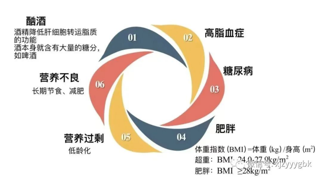 酒精降低肝细胞转运脂质的功能,且酒本身就含有大量的糖分,如啤酒等;
