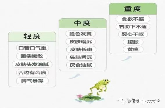 中度:脸色发黄,皮肤暗沉、长斑,头脑昏沉,厌食油腻等;