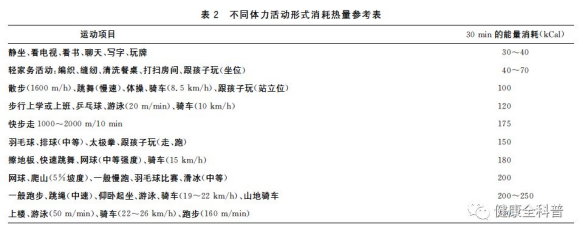 ③对于个体而言,运动量以运动后第二天感觉精力充沛、无不适感为宜。具体形式和消耗的能量可参照下表。