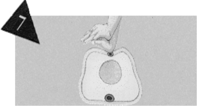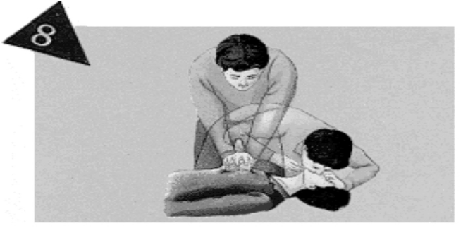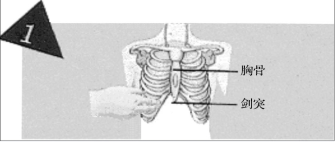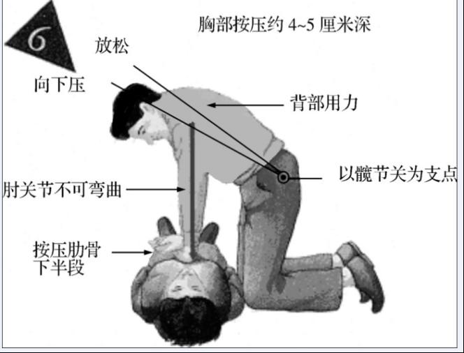 注:按压速度80~100下/分钟,人工呼吸每5秒一次。每次按压都要数数以配合按压速度,口诀:一下——十下,念“一”时手下压,念“下”时手放松,念“二”时手下压,念“下”时手放松,如此交互念至10下。十一,“十”压,“一”松,“十”压,“二”松……这样念到十五。