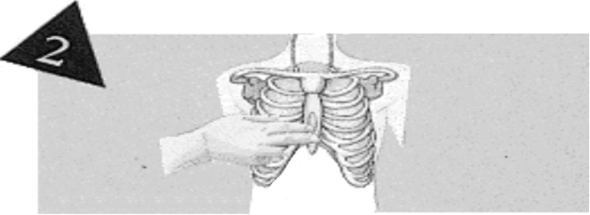 由病人的胸部(近施救者侧),找寻肋骨下缘,沿肋骨缘向上滑动,至肋骨与胸骨交会的胸窝处,即为按压位置。